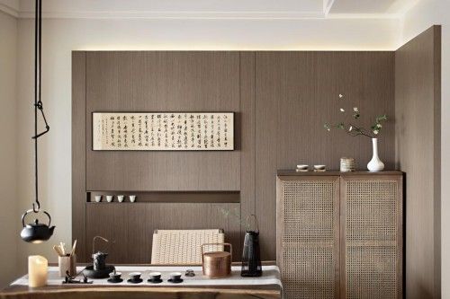 自然界的每一種現(xiàn)象,都與一種心靈狀態(tài)相呼應(yīng)。設(shè)計捕捉這份轉(zhuǎn)瞬即逝的居家感受,重新賦予空間與生活聯(lián)系。暮色之中,人的內(nèi)心不自覺進(jìn)入一種疲態(tài),這時候人需要給自己一個放松的空間,去承載和包容。設(shè)計再次營造了一個令人舒適的氛圍,讓心境回歸到一個自然寧靜的狀態(tài)。 位于端頭的茶室營造了生活的悠然,一如成都人的“關(guān)上門來,白茶清歡無別事”。借暮色煮一杯清茶,夕陽西下,各自在。客廳、餐廳與茶室,隱藏式移門設(shè)計,在整體布局上一以貫之,讓彼此隔而未隔,界而未界,空間互為聯(lián)系。