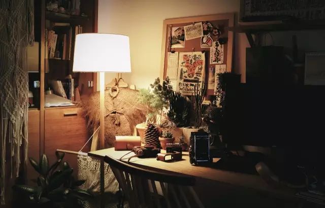 燈下的工作臺(tái)和嵌入墻內(nèi)的書柜是前任主人留下的。 不覺(jué)得和新家格格不入嗎?