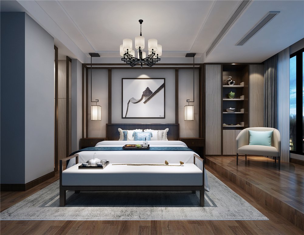 臥室以新中式風格為主,以木質(zhì)線條為主。
