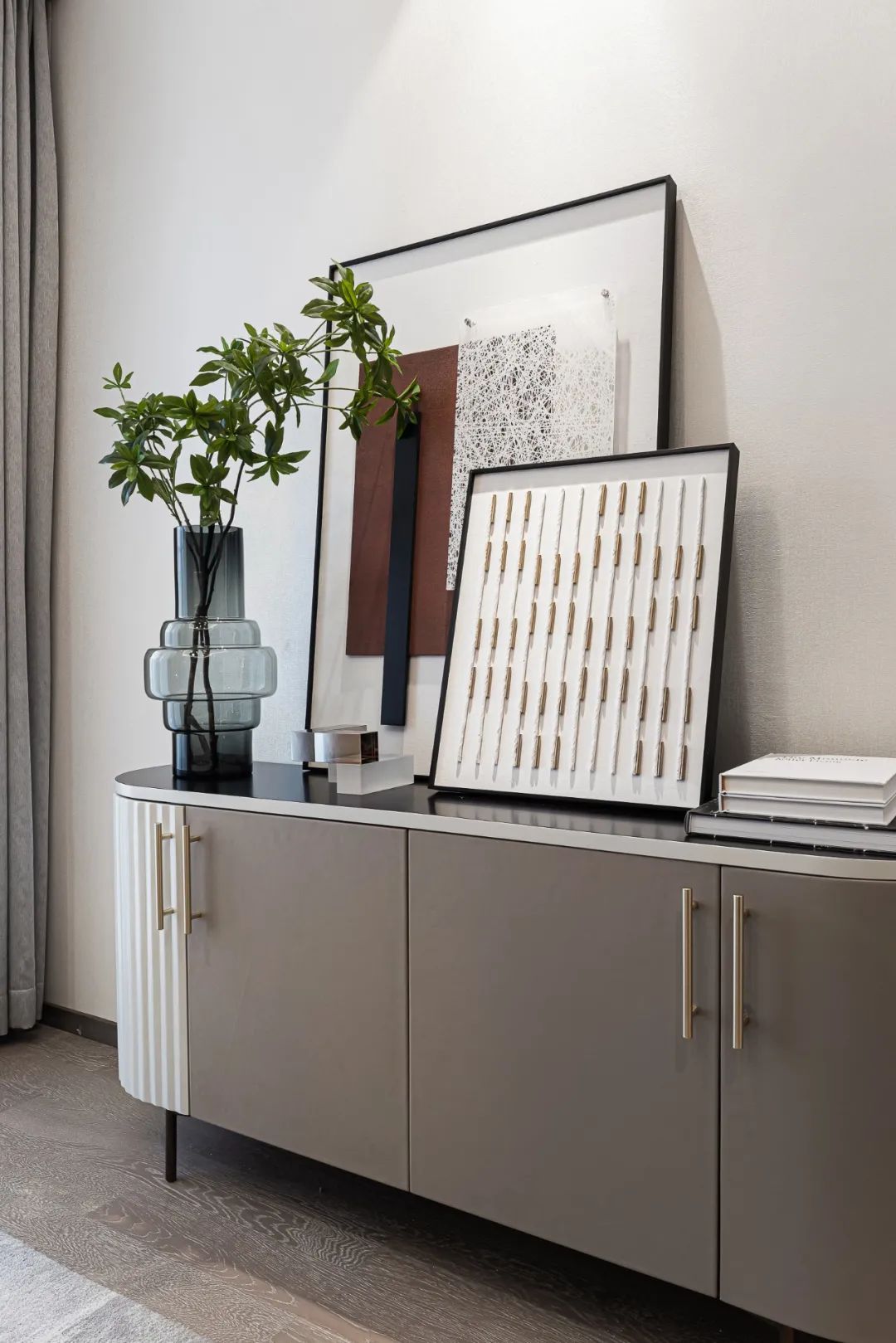 與傳統(tǒng)的客廳布局不同,105戶型的客廳和書房是開放式的,視覺上更加寬敞,有空間延伸感。 由于空間的限制,我們在家具的選擇上堅持簡約、簡約的原則,去掉多余、繁雜的裝飾,讓一切恰到好處。 為了使整個空間和諧統(tǒng)一,主色調(diào)為米灰色,搭配焦糖色。 高品質(zhì)皮革與金屬色的碰撞,賦予空間輕盈奢華的感覺。