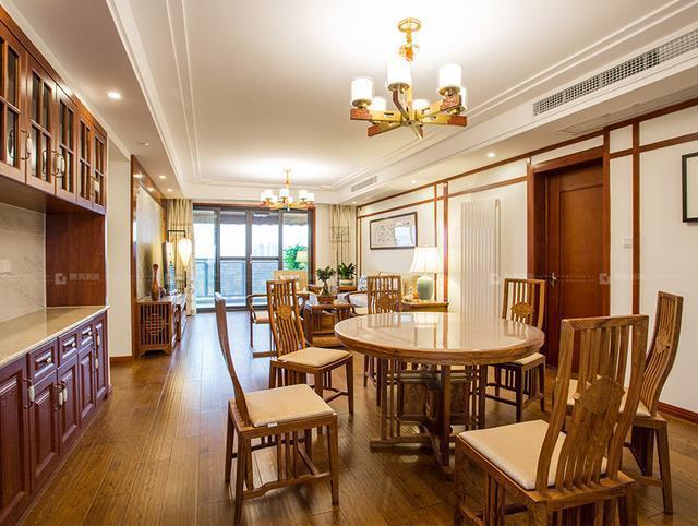 客廳和餐廳吊頂一體化的設(shè)計讓空間更加寬敞,不同形狀的吊燈劃分了功能區(qū)域。 電視墻采用壁紙裝飾,效果非常好,符合新中式風(fēng)格。
