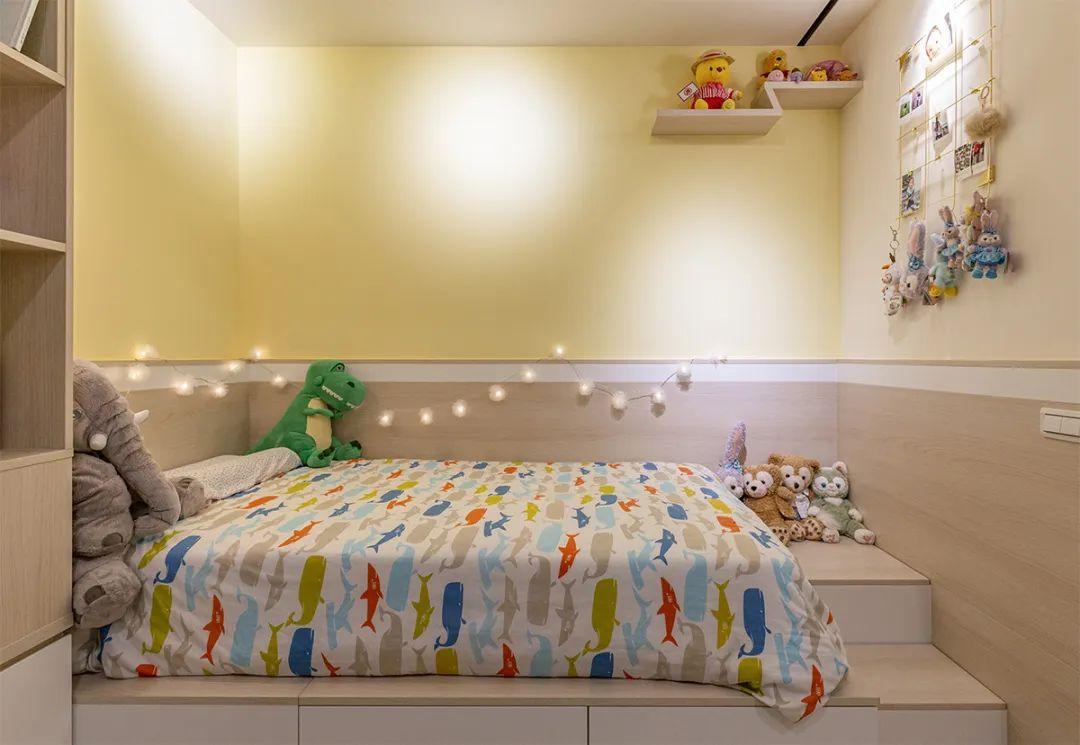 主臥室原有的更衣室被拆除,以擴大主臥室和兒童房的使用面積。 移動一下床的位置,避免屋頂?shù)臋M梁壓在床上,產(chǎn)生壓迫感。