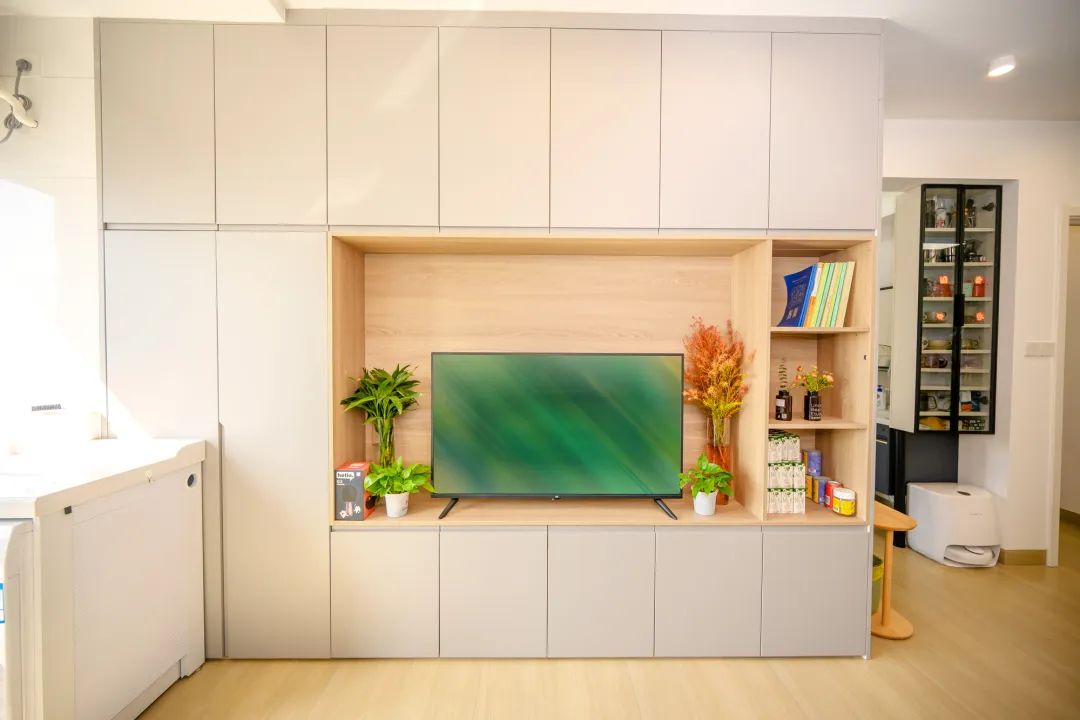 拆除客廳和主臥室之間的墻是全屋改造的亮點之一。 墻體拆除后,吳哥裝飾采用加厚板材+雙面吊柜,滿足功能分區(qū)、隔音、儲物功能。 不但沒有改變原來的布局,整個房子還顯得干凈整潔。
