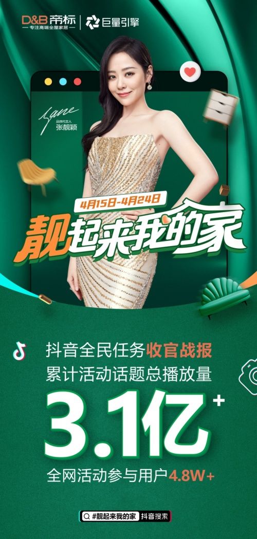 ??4月15-25日,帝標(biāo)家居422全國(guó)置家日主題活動(dòng)期間,帝標(biāo)家居攜手“Doulife 家居節(jié)”、“抖音全民任務(wù)”兩大熱門(mén)IP夢(mèng)幻聯(lián)動(dòng),取得了優(yōu)異的成績(jī)。其中“#靚起來(lái)我的家”抖音全民任務(wù)更是全網(wǎng)刷屏,活動(dòng)結(jié)束累計(jì)活動(dòng)話(huà)題總播放量高達(dá)3.1億+,全網(wǎng)活動(dòng)參與用戶(hù)4.8W+,被年輕人瘋狂種草! ??全平臺(tái)億級(jí)流量帝標(biāo)刷屏破圈 ??營(yíng)銷(xiāo)新利器加速興趣用戶(hù)消費(fèi)轉(zhuǎn)化 ??近年來(lái),隨著短視頻社交方式的崛起,為品牌營(yíng)銷(xiāo)帶來(lái)全新的玩法和傳播方式,也成功拉近了品牌和年輕消費(fèi)者之間的距離,其中抖音作為品牌短視頻營(yíng)銷(xiāo)的主流陣地,結(jié)合不同形式的抖音挑戰(zhàn)賽,以有趣的表現(xiàn)形式和互動(dòng)模式吸引消費(fèi)者參與內(nèi)容共創(chuàng),實(shí)現(xiàn)品牌和用戶(hù)的深度交互,被視為品牌營(yíng)銷(xiāo)的曝光利器。