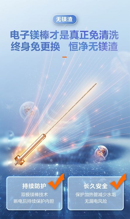 ??電子鎂棒黑科技 無渣無垢終身免更換 ??眾所周知,電熱水器通常采用鎂棒進行防腐,然而,傳統(tǒng)鎂棒一般2年左右就需要更換一次,尤其是在部分水質(zhì)較差的地區(qū)鎂棒表面容易鈍化,被大量鎂渣污水包裹無法保護內(nèi)膽導致漏水,不僅污染水質(zhì),影響人們的健康沐浴生活,還容易引發(fā)安全隱患。