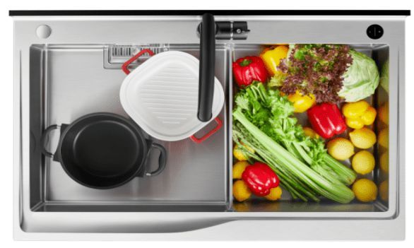 D70集成洗碗機(jī)將水槽、洗碗機(jī)、消毒柜、櫥柜、殘?jiān)幚砑谝惑w。對(duì)比傳統(tǒng)廚房清洗設(shè)備,該設(shè)計(jì)極致利用廚房空間,功能配置更豐富,體驗(yàn)更舒適。