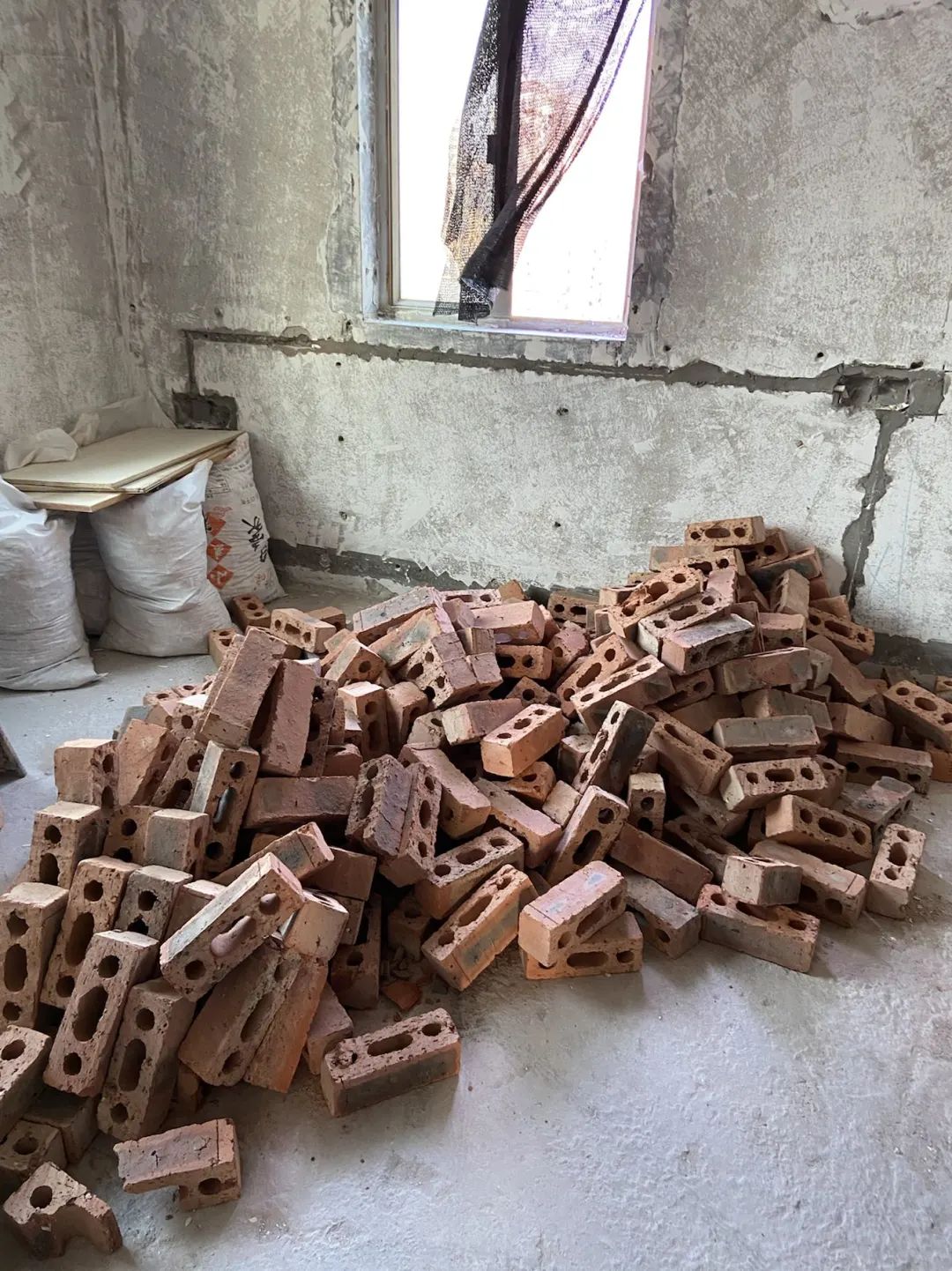 比如下圖的工地,廚房橫梁上的瓷磚還沒有拆除,必須全部拆除。 否則,敲打樓上可能會造成空鼓,甚至掉落。