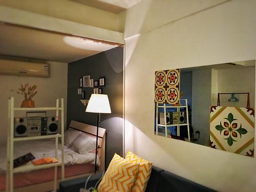 不僅是老房子,就連很多家用電器都非常舊了。 例如,這臺冰箱的外殼發(fā)黃了。 兔子用剩下的壁紙包裹起來,加上一塊舊倉庫里的瓷磚冰箱貼,很有老廈門的感覺。