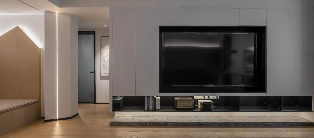 來到客廳空間,首先映入眼簾的就是滿墻的電視柜。 此設計創(chuàng)新了傳統(tǒng)電視柜理念,不僅實現(xiàn)了儲物功能,還增加了視覺美感。