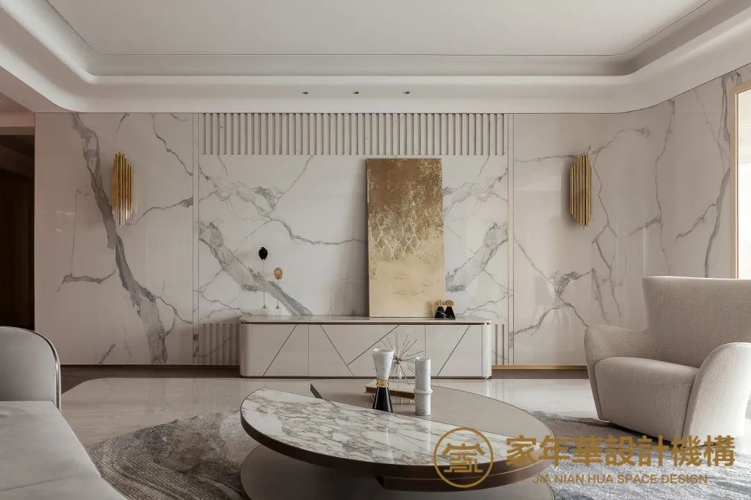 環(huán)形沙發(fā)搭配圓形茶幾,弧形巖板和吊頂,讓整個(gè)空間均勻靈動(dòng),頗具設(shè)計(jì)感。